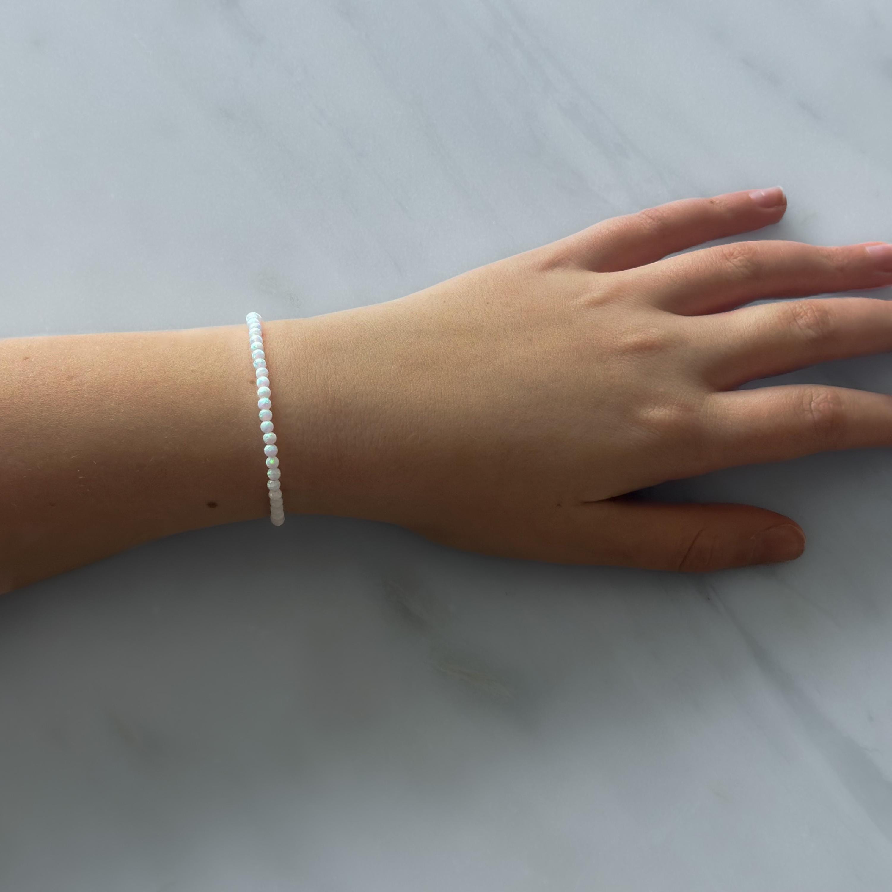 Elevate your accessory collection with this luminous white opal beaded bracelet. It is meticulously crafted to ensure durability and elegance, making it perfect for layering or wearing individually. The lab-made opal beads add a touch of sophistication with a luxurious finish, ideal for any occasion. Embrace the beauty of this bracelet and enhance your style effortlessly.
